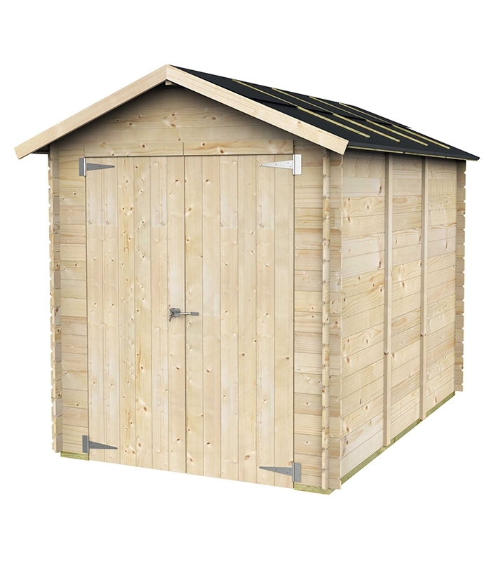 Abri de jardin en bois Fiamma de 4.2 m² de la marque Alce (fabrication italienne) 178 cm de longueur et 273 cm de profondeur avec une double porte et toit double pente.