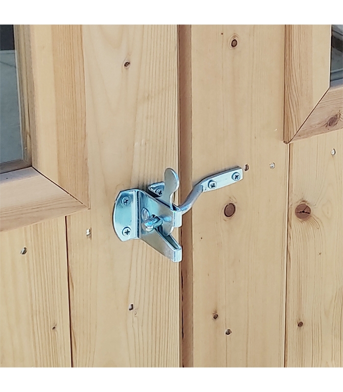 L'abri de jardin de 296 cm de large et 249 cm de profondeur possède une porte à double battant avec fenêtre à châssis fixe en plexiglas et avec un verrou à clé.