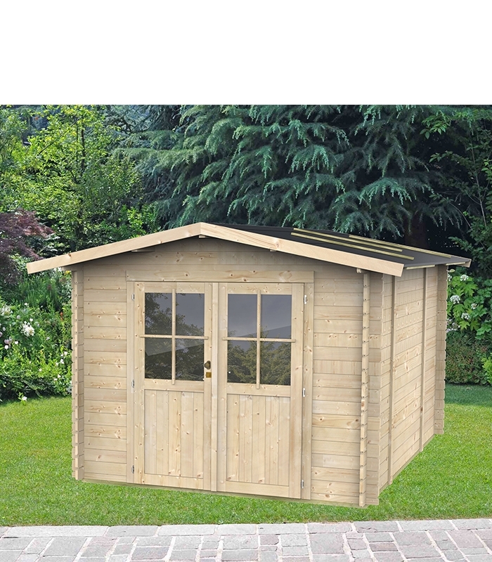 Abri de jardin en bois Opéra de 6,17 m² de la marque Alce (fabrication italienne) 296 cm de longueur et 249 cm de profondeur avec une porte à double battant et fenêtres à châssis fixe en plexiglas.