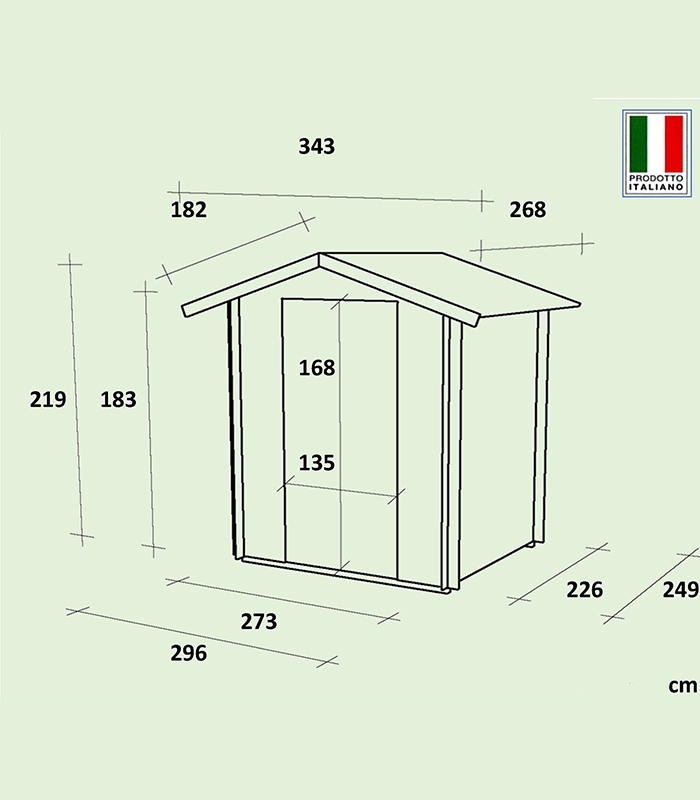 Opéra, l'abri de jardin en bois de la marque italienne Alce. Un abri d'une surface de 6,17 m² avec un toit à double pente.