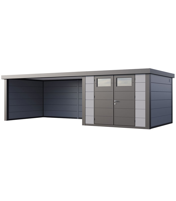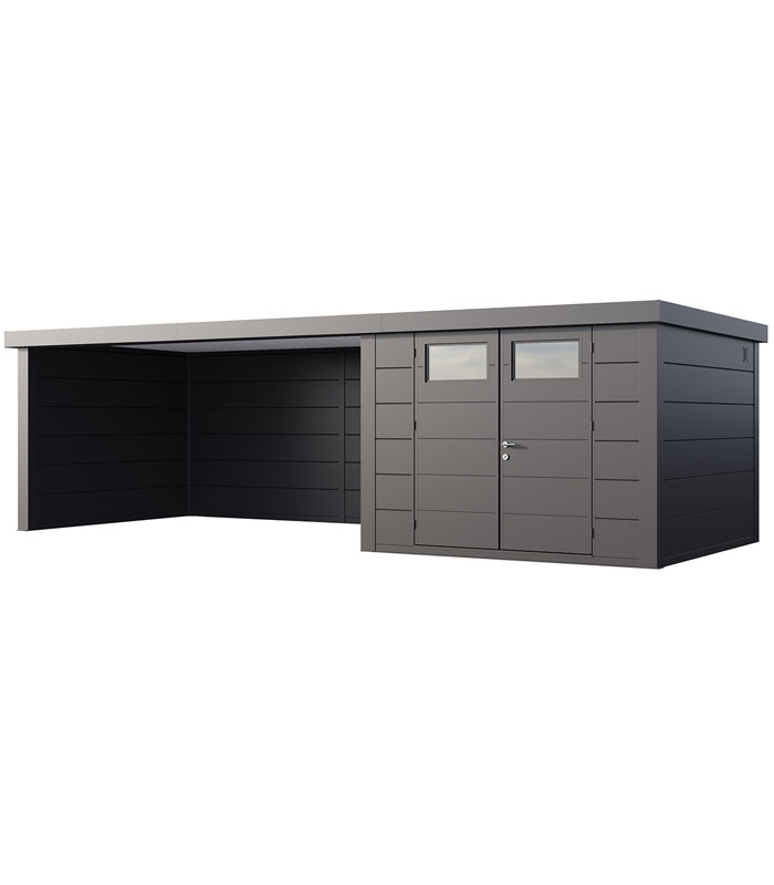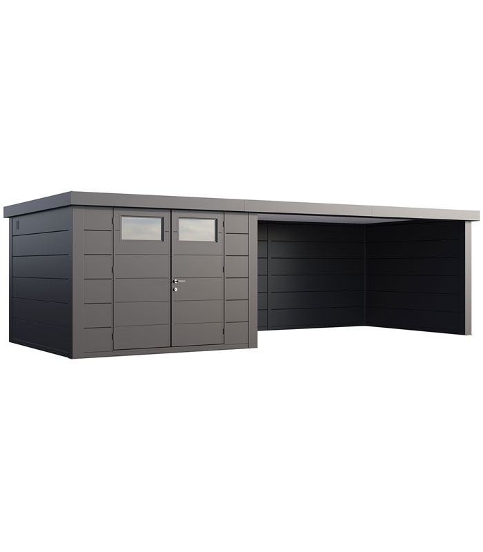 L'abri d'une superficie intérieure de 9,8 m² (3m28 x 2m98) est disponible en 4 coloris : anthracite, gris clair, blanc et blanc & anthracite. Elle dispose d'un grand auvent fermé de format XL et abrité sur 3 côtés, que vous pourrez positionner selon votre souhait sur la gauche ou sur la droite de l'abri. La partie auvent est uniquement disponible en coloris anthracite est vous offrira une superficie de 13,80 m² (4m64 x 3m18).