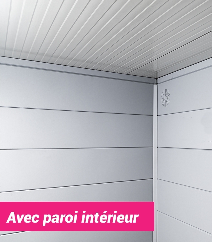 L'abri d'une superficie intérieure de 8,9 m² (2m98 x 2m98) est disponible en 4 coloris : anthracite, gris clair, blanc ou blanc & anthracite. Elle dispose d'un auvent fermé de 10.2m² abrité sur 3 côtés avec 2 fenêtres à chassis fixe, que vous pourrez positionner selon votre souhait sur la gauche ou sur la droite de l'abri. La partie auvent est uniquement disponible en coloris anthracite.