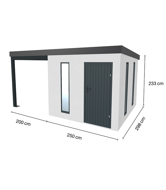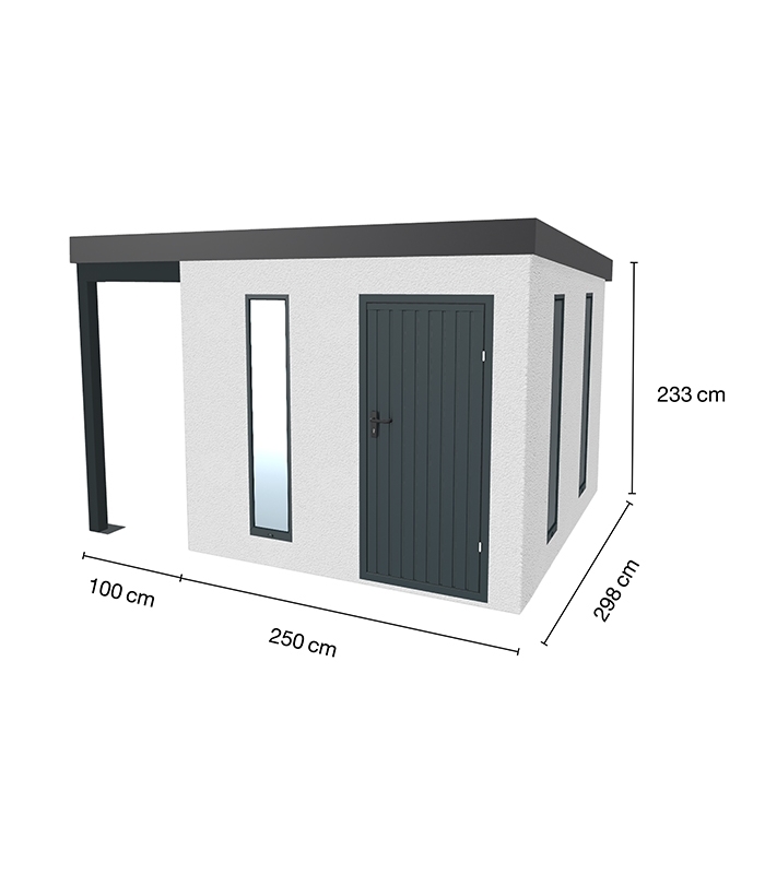 Contrairement aux abris en bois ou en métal classique, l'Urban One utilise un enduit projeté à la main à grain grossier. Ce choix esthétique lui permet de s'aligner visuellement sur les façades des maisons neuves, transformant un simple lieu de stockage en une véritable extension architecturale de votre propriété. Ce revêtement minéral contraste avec élégance avec les éléments de finition gris anthracite (RAL 7016), apportant une touche de sophistication industrielle très actuelle.