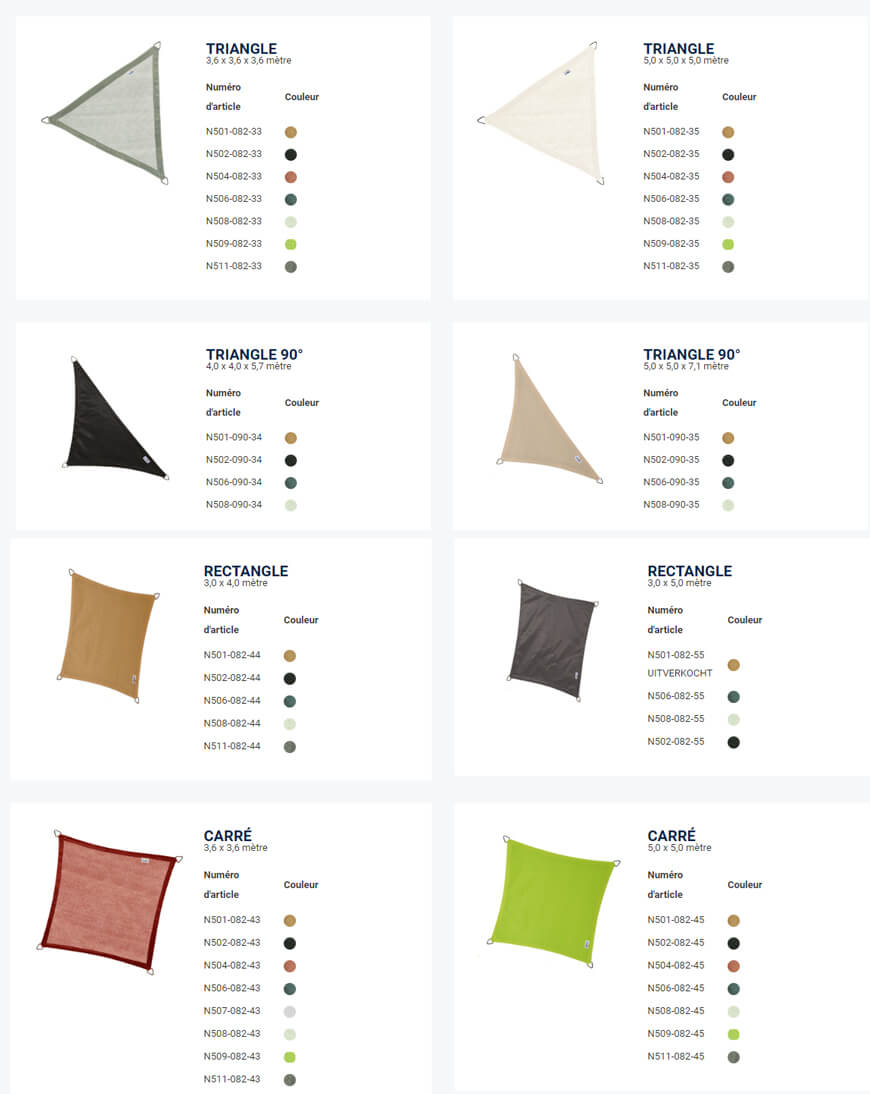 Nous vous conseillons de suspendre votre toile d’ombrage à une inclinaison minimale de 30° pour les tissus Dreamsail® de Nesling pour assurer une bonne évacuation de l’eau de pluie. Les voiles Coolfit® donc perméables peuvent être installées à plat.