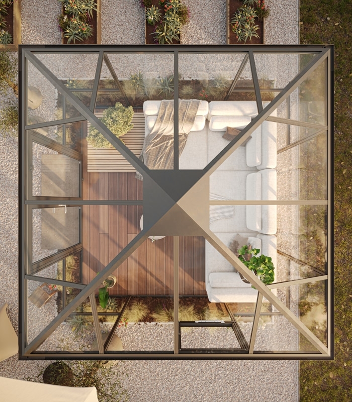 La structure est composée de profilés en aluminium très stables, thermolaqué de couleur gris anthracite. Elle convainc par son aspect élégant, sa grande résistance à la corrosion et sa stabilité à long terme. Comme tous les modèles de KGT, le PaviLux est synonyme de finition précise et de qualité “Made in Germany”.