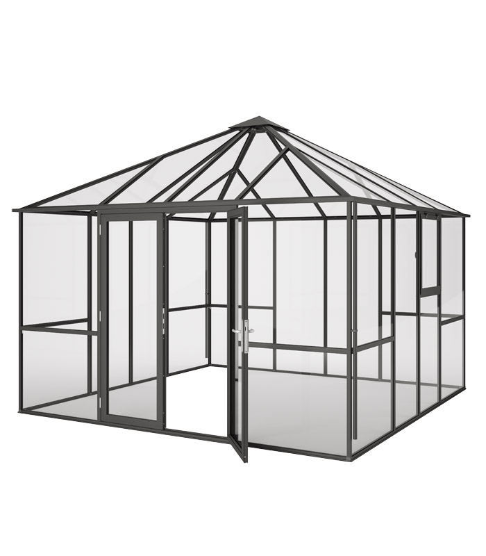 Une caractéristique particulière du PaviLux est la flexibilité de la conception des surfaces latérales. Pour chaque côté, il est possible d’intégrer soit une large porte double, soit deux fenêtres latérales. Cela permet de personnaliser la serre et de l’utiliser aussi bien comme une serre classique que comme un pavillon de jardin moderne. Cette polyvalence fait de PaviLux une solution exceptionnelle pour les amateurs de jardinage exigeants.