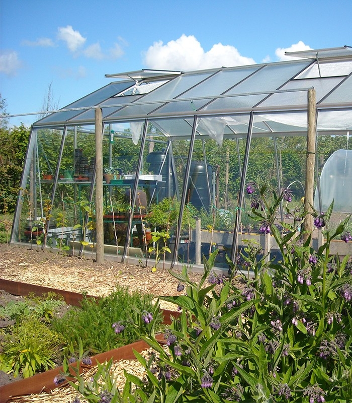 La serre est équipée d'une grande hauteur faîtière en verre trempé martelé et d'un pare-tempête unique. La hauteur faîtière peut s'ouvrir manuellement par un tir-pousse qui se range facilement. La Hauteur faîtière fournit également la ventilation nécessaire et l'alimentation d'air frais.