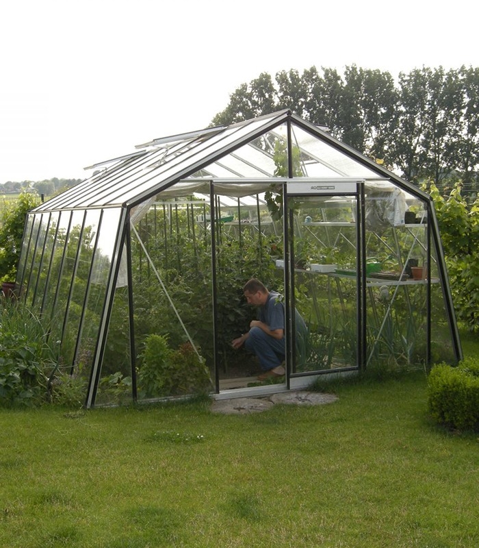 Cette serre de jardin à parois obliques propose une structure en aluminium avec un vitrage de sécurité. L’aluminium en finition naturelle ou noire RAL 9005 apporte un aspect haut de gamme à cette serre de jardin.